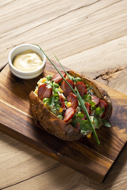 KUMPIR-PIECZONY ZIEMNIAK Z SEREM, PIKANTNĄ KIEŁBASĄ I SAŁATKĄ WARZYWNĄ